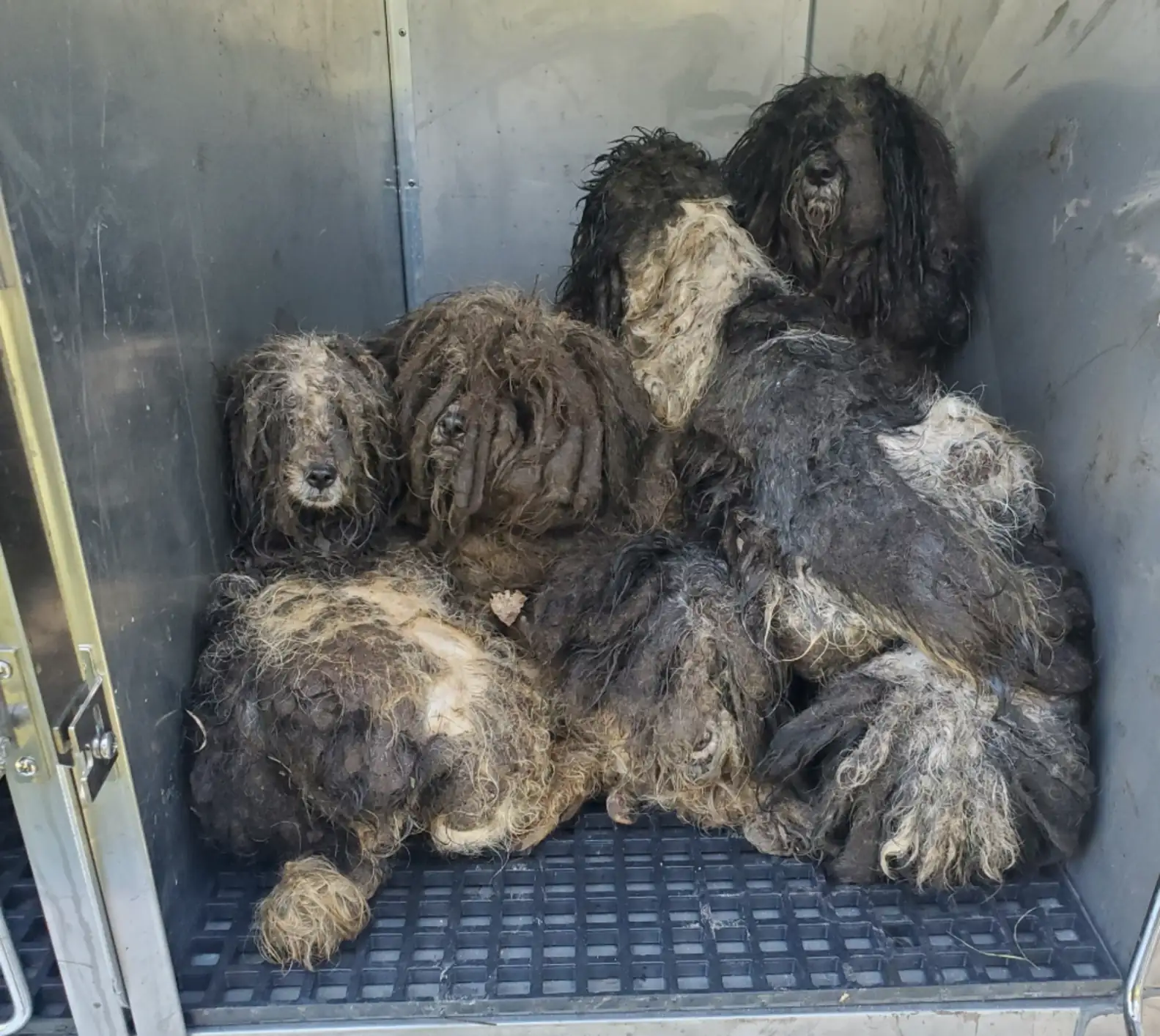 Several furry lumps huddled together near the pond, almost moving as one big creature. Looking closer, the officers realized they were seeing 15 small dogs with wads of matted fur hanging off their tiny bodies.